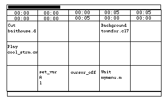 Note that set_var and cursor_off require nothing from the CD, and are set to execute at the same start time as the cut to baithouse.d. Mogul will execute them in order, without any scripted time delays between them. townfor.cl7 however, is loaded from the CD and requies about 00:05 to load.