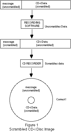 When building a disc image with Philips Media tools (script2disc or master), you are given the option of creating a scrambled or unscrambled disc image. Scrambling is a process that shuffles the data on the physical CD to overcome possible problems in playback that are due to the way the CDs are manufactured. During playback, the CD-i hardware unscrambles the data before processing it. All data, with the exception of audio (CD-DA), on a CD is scrambled.