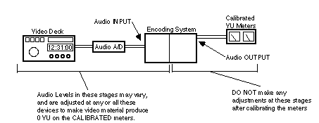 e. when you are encoding from a video deck, you'll need to adjust the DECK'S output gain, or A/D converter gain, or encoder INPUT gain, so that the AVERAGE is around 0 VU (-15 dB absolute) on the calibrated meter. This will keep occasional peaks from clipping (0 dB absolute) the encoder. Depending on the care taken when the audio was laid down on the video tape, you may have to adjust the deck, A/D or encoder gain for every clip, so that all clips produce an average encoded level of 0 VU on the calibrated meter.
